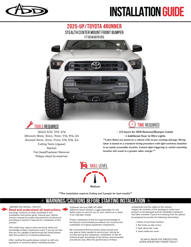 The Stealth Center Mount Front Bumper for the 2025 Toyota 4Runner offers a low-profile OEM-style design with an integrated 20" single-row LED light bar mount and a concealed heavy-duty winch mount. It retains TSS, OEM parking sensors, and all driver-assist features. Includes two integrated 1" thick CNC-machined D-ring clevis mounts for ¾" D-rings. Optional 3/16" aluminum skid plate (AC7105603NA) available. Finished in a two-stage hammer black powder coat and installs with supplied hardware. Proudly made in the USA.
