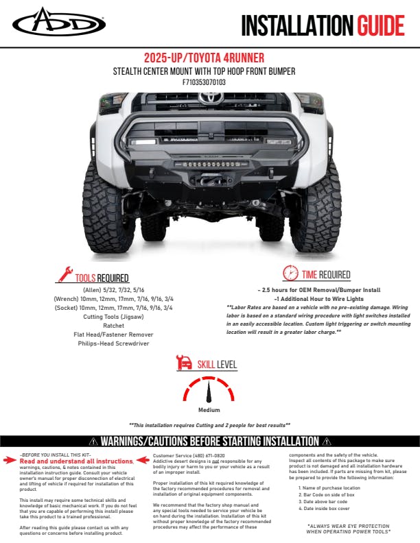 The Stealth Center Mount Front Bumper with Top Hoop for the 2025 Toyota 4Runner offers a low-profile OEM-style design with an integrated 20" single-row LED light bar mount and a concealed heavy-duty winch mount. It retains TSS, OEM parking sensors, and all driver-assist features. Includes two integrated 1" thick CNC-machined D-ring clevis mounts for ¾" D-rings. Optional 3/16" aluminum skid plate (AC7105603NA) available. Finished in a two-stage hammer black powder coat and installs with supplied hardware. Proudly made in the USA.