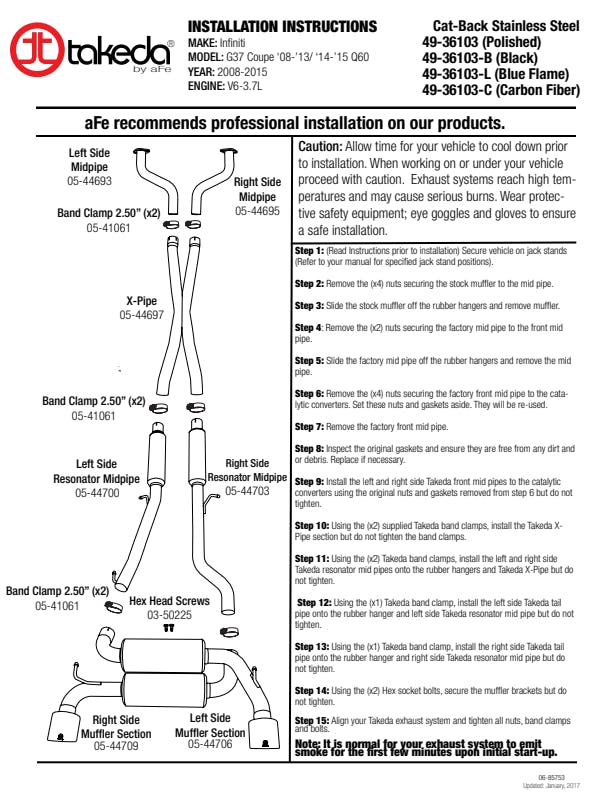 This unique dual transverse exhaust system is constructed form mandrel bent stainless steel and is TIG welded. This system was designed and engineered by tuning the perfect tube lengths; ultimately maximizing performance across the power band while maintaining a great tone. aFe carefully engineered this system to maintain distinct exhaust tones. All systems use factory mounting locations providing stability and hassle free installation. High quality band clamps are used for a complete 360 degree sealing surface. Dual free flowing transverse mufflers are used to absorb high pitch tones producing a powerful sound and unleashing all available horsepower and torque.