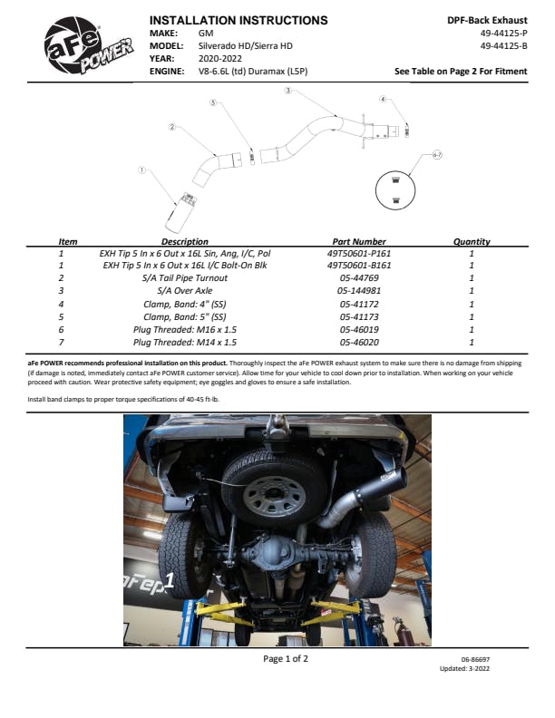 This DPF-back exhaust system is constructed of 5" mandrel-bent 409 stainless steel tubing for maximum strength and durability. Finishing off this exhaust system is a 6" diameter polished 304 stainless steel intercooled clamp-on exhaust tip. The tip features an aFe POWER logo plate riveted on for a unique style. Some cutting may be required, see instruction sheet for further information. Utilizing factory style hangers this system mounts directly to factory mounting locations for a hassle-free installation. Utilizing state-of-the-art computer-aided design technology, this exhaust system is designed for custom, high tolerance factory fitment. 100% MIG-Welded for race-proven strength and durability. This system fits: Double Cab / Short-Bed - 149.4" Wheelbase, Crew Cab / Short-Bed - 158.9" Wheelbase, Double Cab / Long-Bed - 162.4" Wheelbase, Crew Cab / Long-Bed - 172" Wheelbase