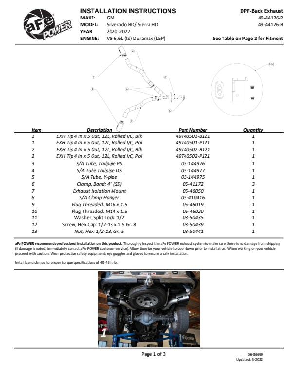 This DPF-back exhaust system is constructed of 4" mandrel-bent 409 stainless steel tubing for maximum strength and durability. Finishing off this exhaust system are dual 5" diameter black 304 stainless steel intercooled clamp-on exhaust tips. The tips features an aFe POWER logo plate riveted on for a unique style. Some cutting may be required, see instruction sheet for further information. Utilizing factory style hangers this system mounts directly to factory mounting locations for a hassle-free installation. A mitered merge collector is used to decrease turbulence and increase exhaust velocity resulting in increased horsepower, torque and improved throttle response. Utilizing state-of-the-art computer-aided design technology, this exhaust system is designed for custom, high tolerance factory fitment. 100% MIG-Welded for race-proven strength and durability. This system fits: Double Cab / Short-Bed - 149.4" Wheelbase, Crew Cab / Short-Bed - 158.9" Wheelbase, Double Cab / Long-Bed - 162.4" Wheelbase, Crew Cab / Long-Bed - 172" Wheelbase