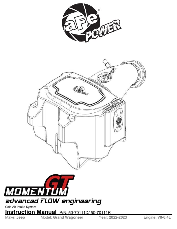 Designed to increase horsepower, torque, and throttle response, this cold air intake system provides your engine with a steady stream of cooler, denser air. The result? More power and better performance, whether you're hitting the trails or cruising down the highway. With its easy bolt-on installation, this Momentum GT cold air intake system is a must-have upgrade for any Jeep Grand Wagoneer owner looking to maximize their vehicle's potential.Large Five Layer Performance Air Filter:Momentum’s unique filter-to-housing interface was built to feature the largest air filter possible. This 9” tall, pre-oiled 360-degree radial flow air filter features our pre-oiled Pro 5R media with five layers of progressively finer cotton gauze media for maximum performance and filtration. Its inverted top and large surface area provide much longer life between maintenance intervals. This media is perfect for street use.Unique One-Piece Housing:The smooth one-piece sealed housing, constructed of heat-resistant cross-linked polyethylene (XLPE), features our patent-pending filter-to-housing interface. Its innovative design minimizes the total number of parts, making for an easy installation. A large, clear sight window allows for hassle-free filter inspection, without having to disassemble your system.Hassle-Free Installation:This intake is designed to use factory mounting locations, minimizing the use of unnecessary hardware, ensuring a perfect fit every time. Its revolutionary design, featuring our patent pending filter-to-housing interface uses half the number of parts of a traditional cold air intake system.Premium Components:Stainless-steel worm clamps are included for strength, and a premium silicone bellow coupling allows for ample flexibility.