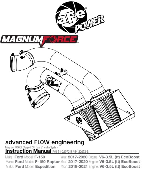 Dual Large 5-Layer Performance Air Filters: This sealed intake system utilizes pre-oiled, large 7" tall radial flow performance air filters with 5-layers of progressive finer mesh cotton media providing maximum airflow and performance. Top Mounted Heat Shield Design: aFe developed this wrinkle-black powder-coated aluminum heat shield to snap onto the top of the lower half of the factory air box to provide a hassle-free installation utilizing factory mounting locations. Large Dual 3" Intake Tubes: Dual Mandrel-bent Wrinkle-black Powder-coated aluminum intake tubes are designed with an H-pipe to balance intake tube pressure and maximizes airflow and velocity Hassle-Free Installation: All clamps, couplings, and hardware are included for hassle-free installation. This is a direct bolt-on kit that requires no cutting or drilling on factory parts. Note: This product is not currently CARB exempt and is not available for sale in California or for use on any vehicle registered with the California Department of Motor Vehicle.