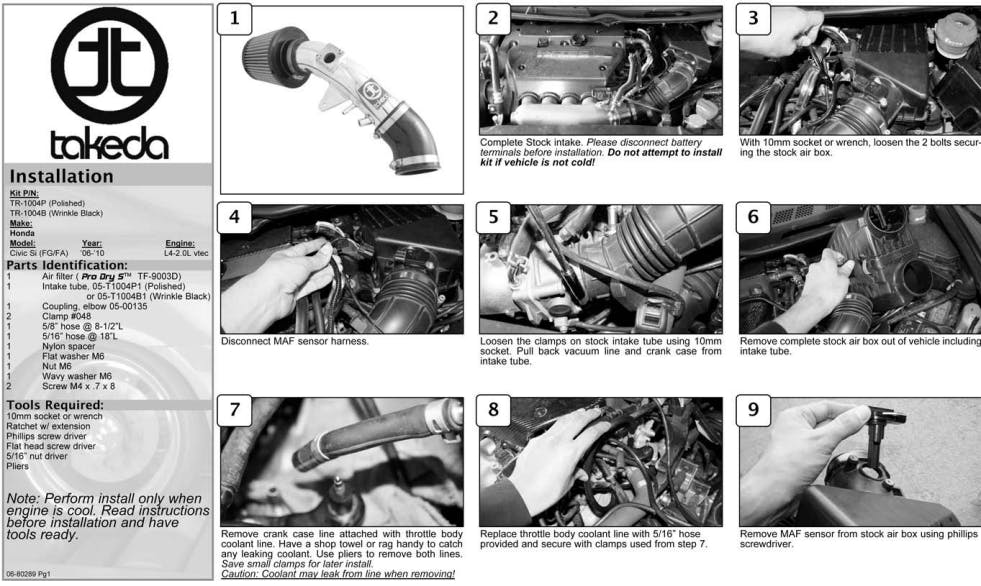 Takeda intakes are constructed out of lightweight black wrinkle finish aluminum tubing or clear-coat anodized polished tubing for maximum air flow and a great style. This intake uses a large 360 degree high flow Pro DRY S air filter for maximum flow, filtration and convenience. The Pro DRY S air filter requires no oils and cleans with simple soap and water. Takeda intakes come complete with all tubing, filters, couplers and hardware for an easy installation.