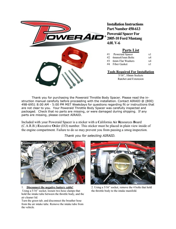 The AIRAID Throttle Body Spacer is designed to enhance mid-range torque using a patented Helix Bore which spins intake air going through the throttle body spacer. Includes mounting hardware.