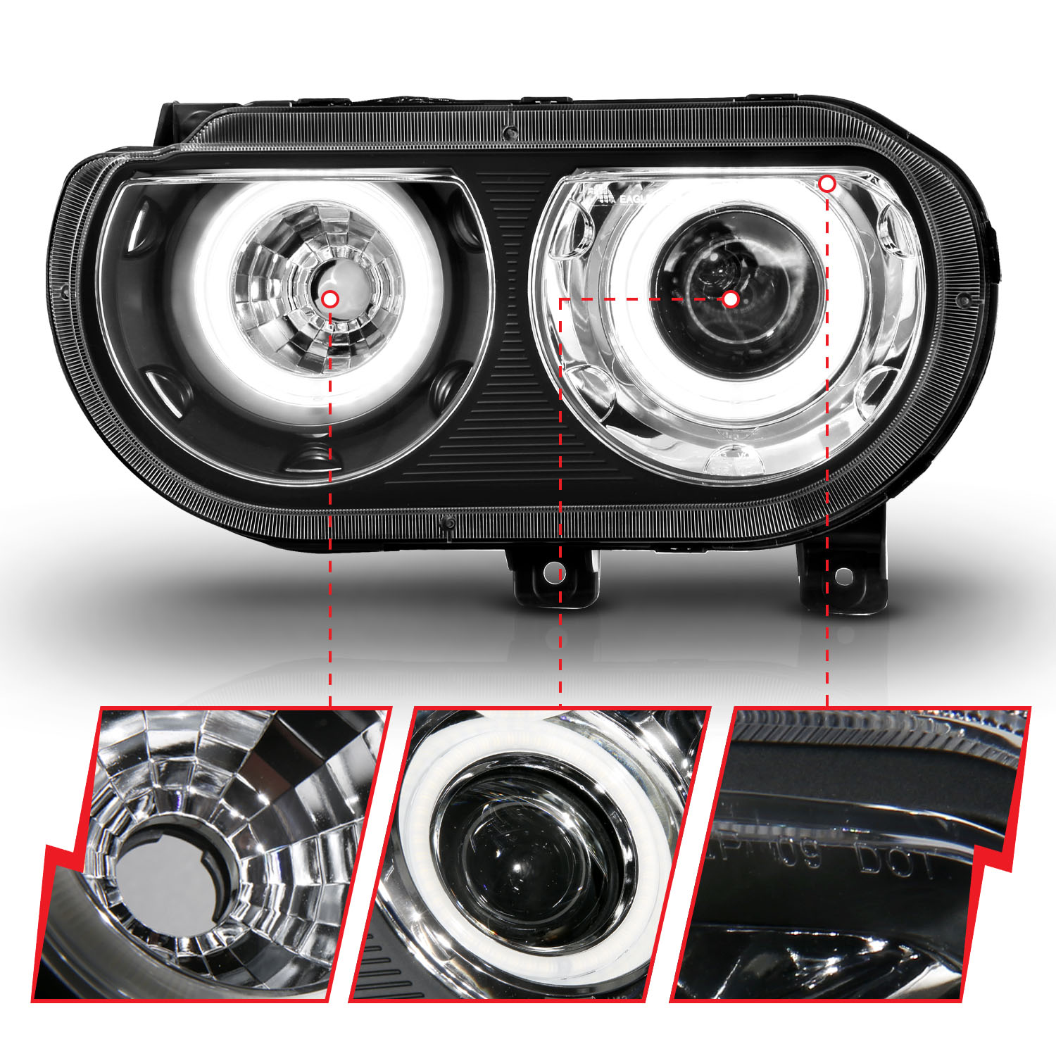 Projector Headlight Set, w/Halo, Clear Lens, Black Housing, Pair, CCFL, For Use w/Non HID Models Only, . Guaranteed To Improve Your Vehicles Appearance. Rigorously Tested For Fit And Function. Simple Plug And Play. No Modifications Required. Easy Installation Using Common Hand Tools. Uses Stock Mounting Locations And Hardware. D.O.T. Compliant To S.A.E. Standards. Sold As A Pair. Does Not Fit Models With Factory HID Bulbs.