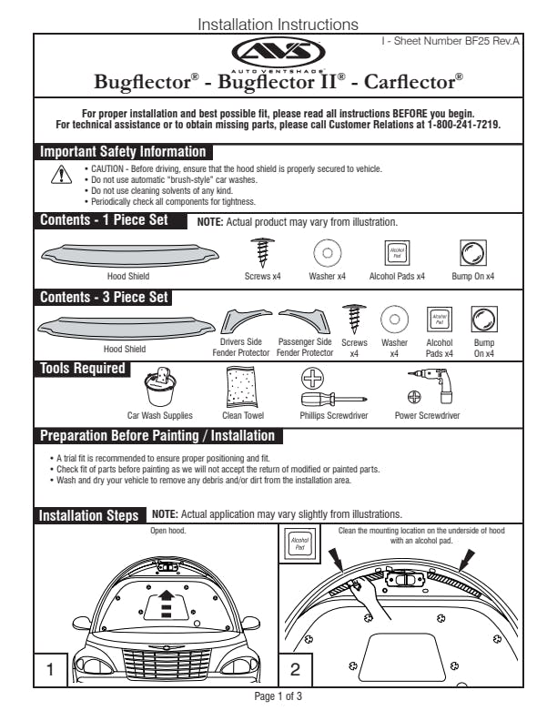 AVS Bugflector II(R) is the highest-profile design providing maximum hood, fender, and windshield protection. The off-the-hood design allows for easy cleaning and waxing. Bugflector II are custom-molded, rugged, car wash safe and easy to install with no-drilling required. Made in the USA with a Limited Lifetime Warranty.