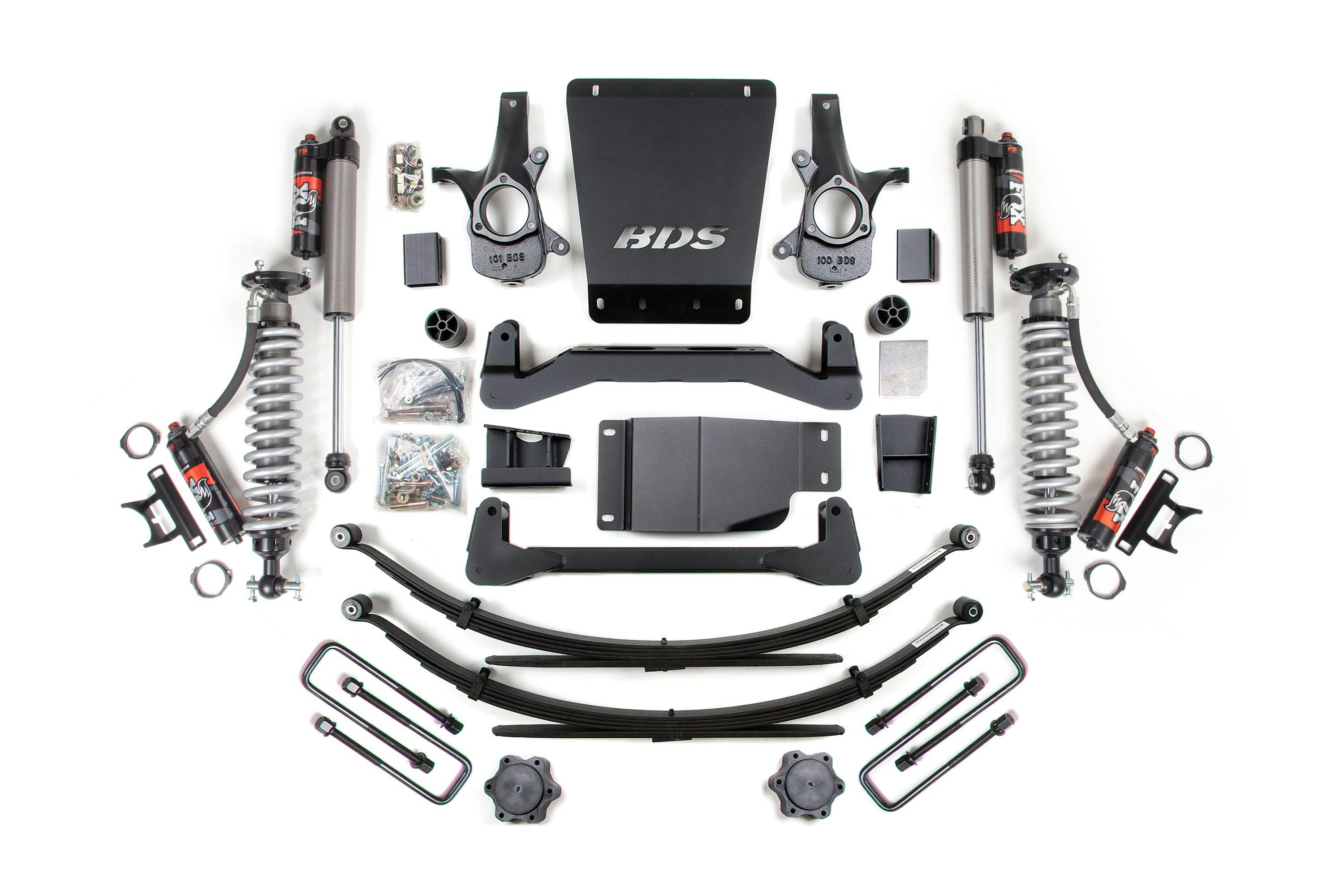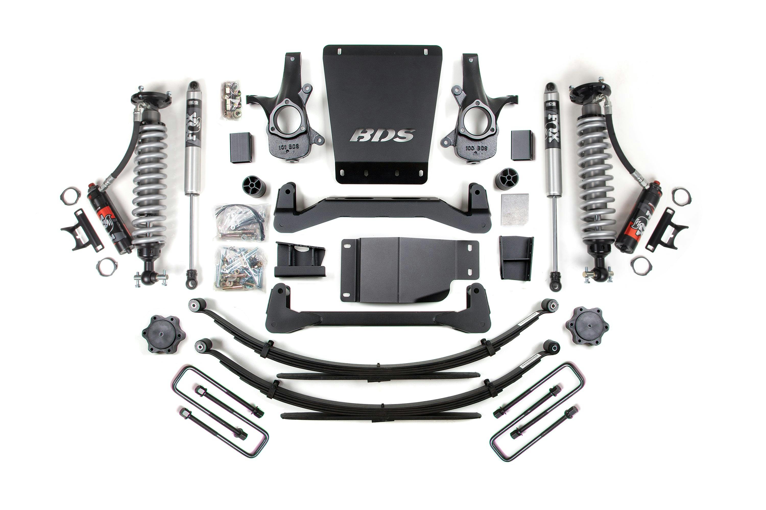 BDS corrects steering geometry at the new, taller ride height using a pair of high-strength, CNC-machined, ductile cast-iron steering knuckles designed to work with factory tie rod ends to maintain steering angles for proper function and ESC compatibility.- Fox 2.5 Shocks are explicitly designed for increased travel and the ability to soak up the roughest terrain.