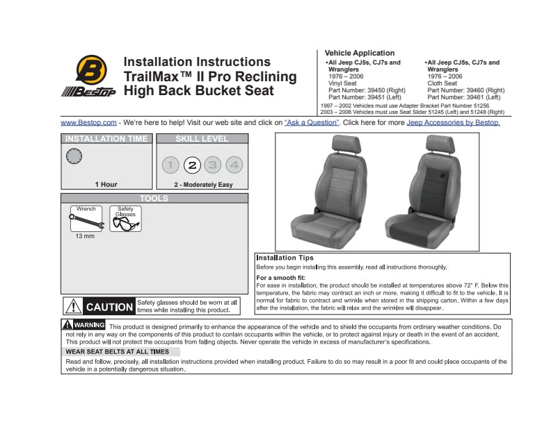 Our Pro seat line is the best we offer so you can replace worn-out, lumpy, uncomfortable factory seats with the ergonomic design made with the highest-quality materials. Make first-class comfort, function, affordability and durability yours. 1997-2002 and 2003-2006 Wranglers require Seat Adapter Brackets sold separately. Seats sold individually.