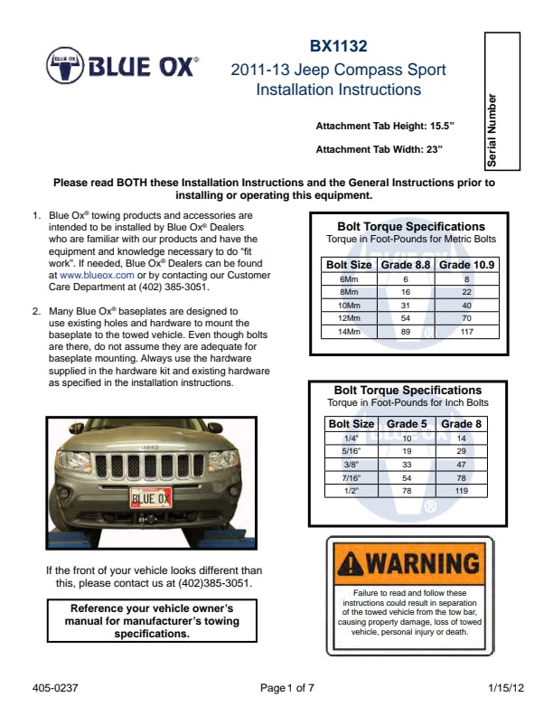 Please read BOTH these Installation Instructions and the General Information sheet prior to installing or operating this equipment. Blue Ox® towing products and accessories are intended to be installed by Blue Ox® Dealers who are familiar with our products and have the equipment and knowledge necessary to do “fit work”. Many Blue Ox® baseplates are designed to use existing holes and hardware to mount the baseplate to the towed vehicle. Even though bolts are there, do not assume they are adequate for baseplate mounting. Always use the hardware supplied in the hardware kit and existing hardware as specified in the installation instructions.