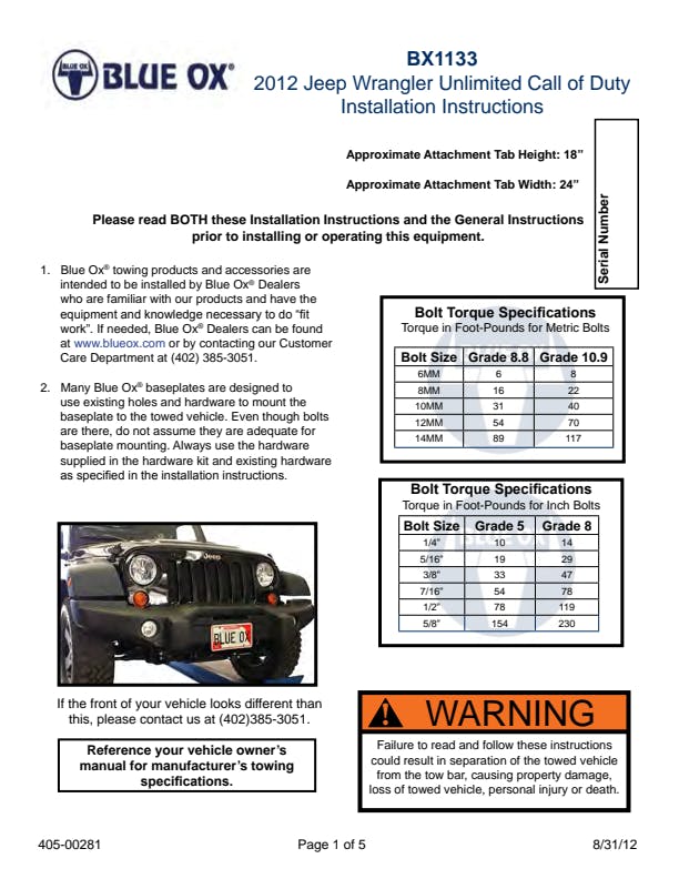 Please read BOTH these Installation Instructions and the General Information sheet prior to installing or operating this equipment. Blue Ox® towing products and accessories are intended to be installed by Blue Ox® Dealers who are familiar with our products and have the equipment and knowledge necessary to do “fit work”. Many Blue Ox® baseplates are designed to use existing holes and hardware to mount the baseplate to the towed vehicle. Even though bolts are there, do not assume they are adequate for baseplate mounting. Always use the hardware supplied in the hardware kit and existing hardware as specified in the installation instructions.