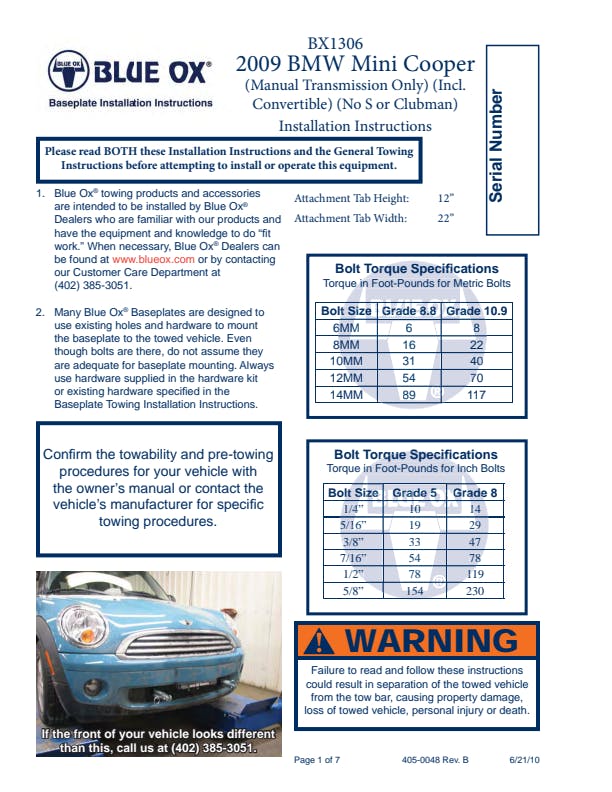 Please read BOTH these Installation Instructions and the General Information sheet prior to installing or operating this equipment. Blue Ox® towing products and accessories are intended to be installed by Blue Ox® Dealers who are familiar with our products and have the equipment and knowledge necessary to do “fit work”. Many Blue Ox® baseplates are designed to use existing holes and hardware to mount the baseplate to the towed vehicle. Even though bolts are there, do not assume they are adequate for baseplate mounting. Always use the hardware supplied in the hardware kit and existing hardware as specified in the installation instructions.