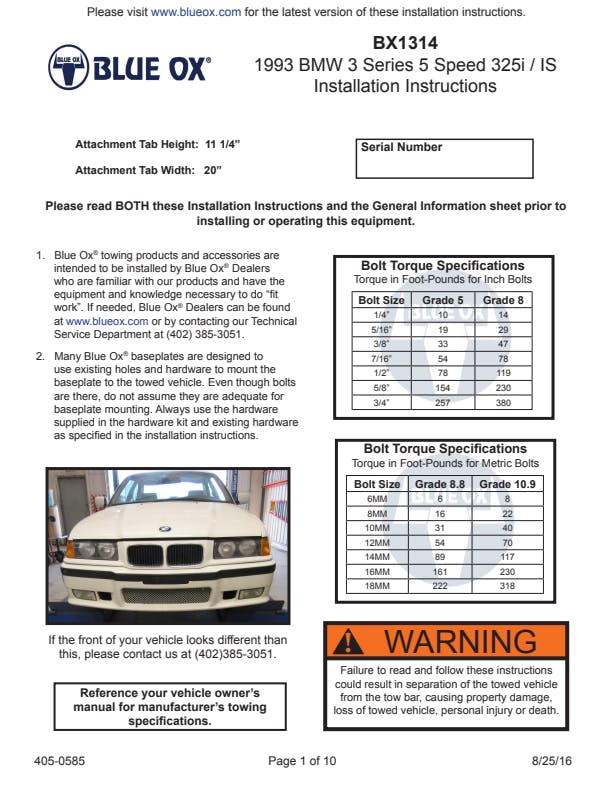 Please read BOTH these Installation Instructions and the General Information sheet prior to installing or operating this equipment. Blue Ox® towing products and accessories are intended to be installed by Blue Ox® Dealers who are familiar with our products and have the equipment and knowledge necessary to do “fit work”. Many Blue Ox® baseplates are designed to use existing holes and hardware to mount the baseplate to the towed vehicle. Even though bolts are there, do not assume they are adequate for baseplate mounting. Always use the hardware supplied in the hardware kit and existing hardware as specified in the installation instructions.