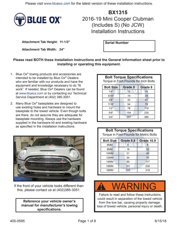 Please read BOTH these Installation Instructions and the General Information sheet prior to installing or operating this equipment. Blue Ox® towing products and accessories are intended to be installed by Blue Ox® Dealers who are familiar with our products and have the equipment and knowledge necessary to do “fit work”. Many Blue Ox® baseplates are designed to use existing holes and hardware to mount the baseplate to the towed vehicle. Even though bolts are there, do not assume they are adequate for baseplate mounting. Always use the hardware supplied in the hardware kit and existing hardware as specified in the installation instructions.
