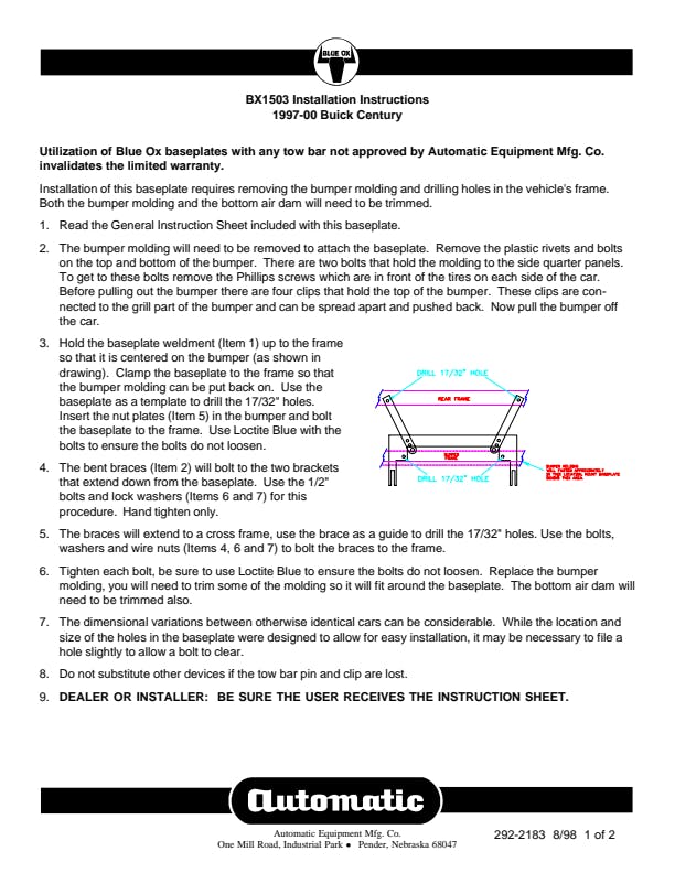 Please read BOTH these Installation Instructions and the General Information sheet prior to installing or operating this equipment. Blue Ox® towing products and accessories are intended to be installed by Blue Ox® Dealers who are familiar with our products and have the equipment and knowledge necessary to do “fit work”. Many Blue Ox® baseplates are designed to use existing holes and hardware to mount the baseplate to the towed vehicle. Even though bolts are there, do not assume they are adequate for baseplate mounting. Always use the hardware supplied in the hardware kit and existing hardware as specified in the installation instructions.