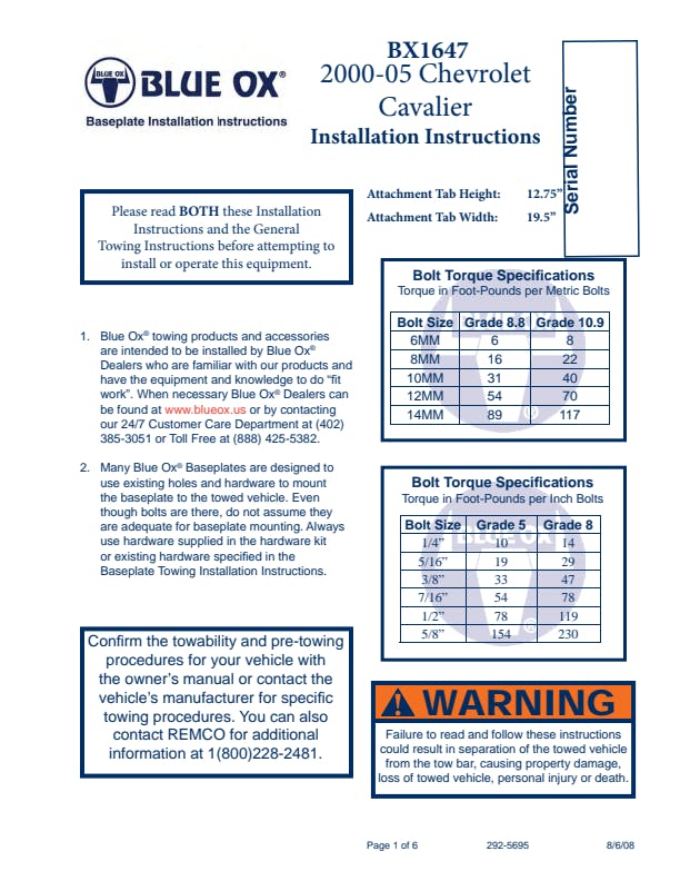 Please read BOTH these Installation Instructions and the General Information sheet prior to installing or operating this equipment. Blue Ox® towing products and accessories are intended to be installed by Blue Ox® Dealers who are familiar with our products and have the equipment and knowledge necessary to do “fit work”. Many Blue Ox® baseplates are designed to use existing holes and hardware to mount the baseplate to the towed vehicle. Even though bolts are there, do not assume they are adequate for baseplate mounting. Always use the hardware supplied in the hardware kit and existing hardware as specified in the installation instructions.