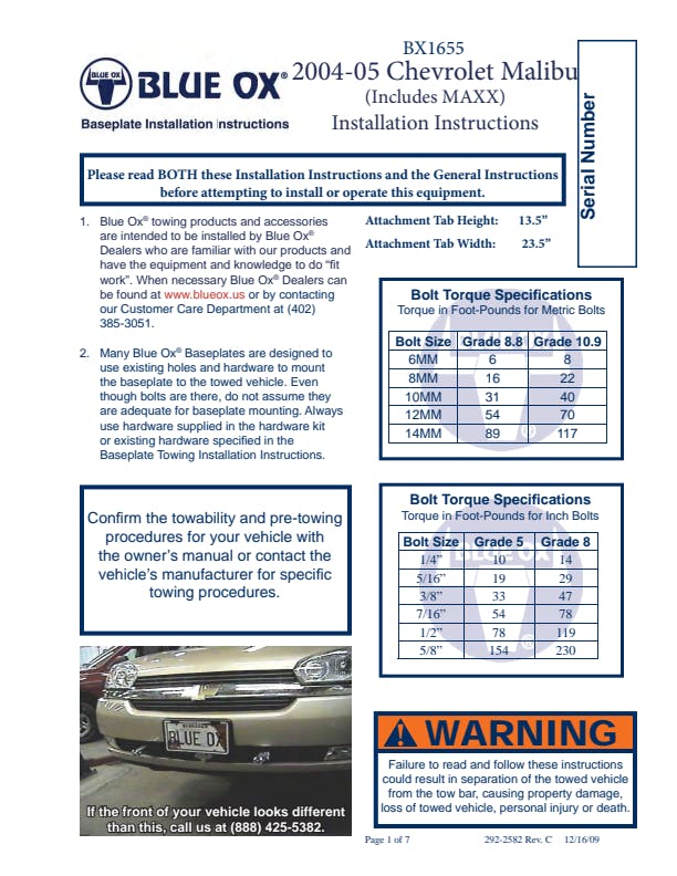 Please read BOTH these Installation Instructions and the General Information sheet prior to installing or operating this equipment. Blue Ox® towing products and accessories are intended to be installed by Blue Ox® Dealers who are familiar with our products and have the equipment and knowledge necessary to do “fit work”. Many Blue Ox® baseplates are designed to use existing holes and hardware to mount the baseplate to the towed vehicle. Even though bolts are there, do not assume they are adequate for baseplate mounting. Always use the hardware supplied in the hardware kit and existing hardware as specified in the installation instructions.