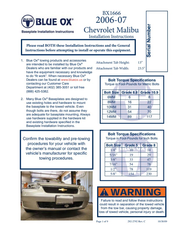 Please read BOTH these Installation Instructions and the General Information sheet prior to installing or operating this equipment. Blue Ox® towing products and accessories are intended to be installed by Blue Ox® Dealers who are familiar with our products and have the equipment and knowledge necessary to do “fit work”. Many Blue Ox® baseplates are designed to use existing holes and hardware to mount the baseplate to the towed vehicle. Even though bolts are there, do not assume they are adequate for baseplate mounting. Always use the hardware supplied in the hardware kit and existing hardware as specified in the installation instructions.