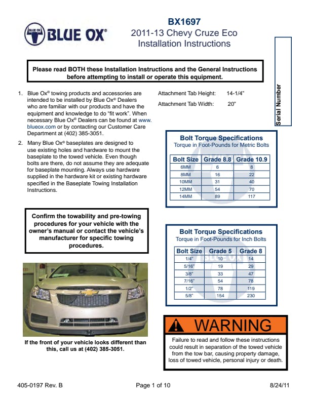 Please read BOTH these Installation Instructions and the General Information sheet prior to installing or operating this equipment. Blue Ox® towing products and accessories are intended to be installed by Blue Ox® Dealers who are familiar with our products and have the equipment and knowledge necessary to do “fit work”. Many Blue Ox® baseplates are designed to use existing holes and hardware to mount the baseplate to the towed vehicle. Even though bolts are there, do not assume they are adequate for baseplate mounting. Always use the hardware supplied in the hardware kit and existing hardware as specified in the installation instructions.