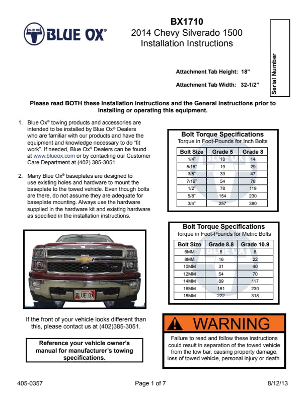 Please read BOTH these Installation Instructions and the General Information sheet prior to installing or operating this equipment. Blue Ox® towing products and accessories are intended to be installed by Blue Ox® Dealers who are familiar with our products and have the equipment and knowledge necessary to do “fit work”. Many Blue Ox® baseplates are designed to use existing holes and hardware to mount the baseplate to the towed vehicle. Even though bolts are there, do not assume they are adequate for baseplate mounting. Always use the hardware supplied in the hardware kit and existing hardware as specified in the installation instructions.