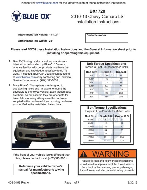 Please read BOTH these Installation Instructions and the General Information sheet prior to installing or operating this equipment. Blue Ox® towing products and accessories are intended to be installed by Blue Ox® Dealers who are familiar with our products and have the equipment and knowledge necessary to do “fit work”. Many Blue Ox® baseplates are designed to use existing holes and hardware to mount the baseplate to the towed vehicle. Even though bolts are there, do not assume they are adequate for baseplate mounting. Always use the hardware supplied in the hardware kit and existing hardware as specified in the installation instructions.