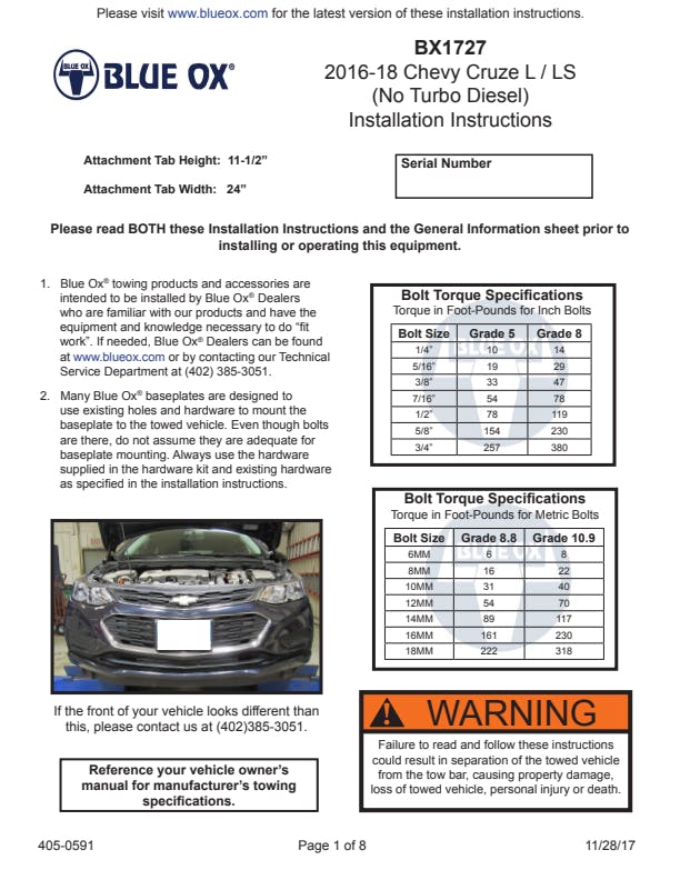 Please read BOTH these Installation Instructions and the General Information sheet prior to installing or operating this equipment. Blue Ox® towing products and accessories are intended to be installed by Blue Ox® Dealers who are familiar with our products and have the equipment and knowledge necessary to do “fit work”. Many Blue Ox® baseplates are designed to use existing holes and hardware to mount the baseplate to the towed vehicle. Even though bolts are there, do not assume they are adequate for baseplate mounting. Always use the hardware supplied in the hardware kit and existing hardware as specified in the installation instructions.