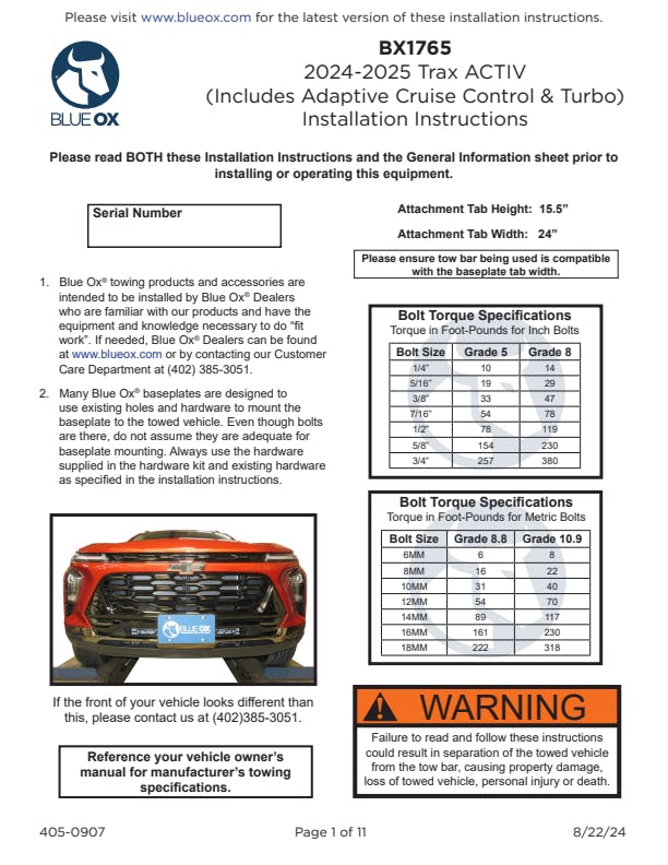 Please read BOTH these Installation Instructions and the General Information sheet prior to installing or operating this equipment. Blue Ox® towing products and accessories are intended to be installed by Blue Ox® Dealers who are familiar with our products and have the equipment and knowledge necessary to do “fit work”. Many Blue Ox® baseplates are designed to use existing holes and hardware to mount the baseplate to the towed vehicle. Even though bolts are there, do not assume they are adequate for baseplate mounting. Always use the hardware supplied in the hardware kit and existing hardware as specified in the installation instructions.