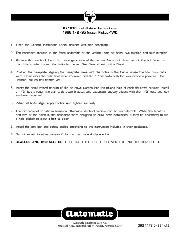 Please read BOTH these Installation Instructions and the General Information sheet prior to installing or operating this equipment. Blue Ox® towing products and accessories are intended to be installed by Blue Ox® Dealers who are familiar with our products and have the equipment and knowledge necessary to do “fit work”. Many Blue Ox® baseplates are designed to use existing holes and hardware to mount the baseplate to the towed vehicle. Even though bolts are there, do not assume they are adequate for baseplate mounting. Always use the hardware supplied in the hardware kit and existing hardware as specified in the installation instructions.