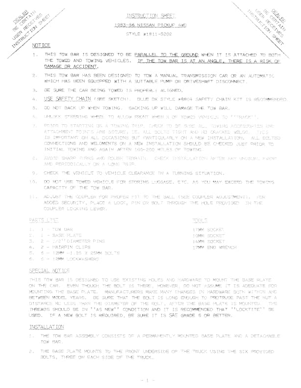 Please read BOTH these Installation Instructions and the General Information sheet prior to installing or operating this equipment. Blue Ox® towing products and accessories are intended to be installed by Blue Ox® Dealers who are familiar with our products and have the equipment and knowledge necessary to do “fit work”. Many Blue Ox® baseplates are designed to use existing holes and hardware to mount the baseplate to the towed vehicle. Even though bolts are there, do not assume they are adequate for baseplate mounting. Always use the hardware supplied in the hardware kit and existing hardware as specified in the installation instructions.