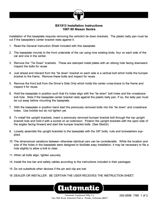 Please read BOTH these Installation Instructions and the General Information sheet prior to installing or operating this equipment. Blue Ox® towing products and accessories are intended to be installed by Blue Ox® Dealers who are familiar with our products and have the equipment and knowledge necessary to do “fit work”. Many Blue Ox® baseplates are designed to use existing holes and hardware to mount the baseplate to the towed vehicle. Even though bolts are there, do not assume they are adequate for baseplate mounting. Always use the hardware supplied in the hardware kit and existing hardware as specified in the installation instructions.