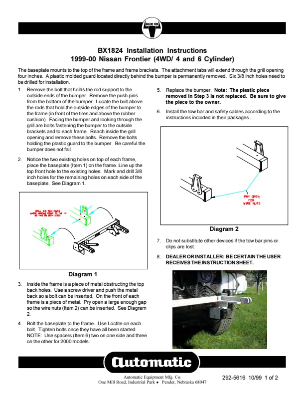 Please read BOTH these Installation Instructions and the General Information sheet prior to installing or operating this equipment. Blue Ox® towing products and accessories are intended to be installed by Blue Ox® Dealers who are familiar with our products and have the equipment and knowledge necessary to do “fit work”. Many Blue Ox® baseplates are designed to use existing holes and hardware to mount the baseplate to the towed vehicle. Even though bolts are there, do not assume they are adequate for baseplate mounting. Always use the hardware supplied in the hardware kit and existing hardware as specified in the installation instructions.