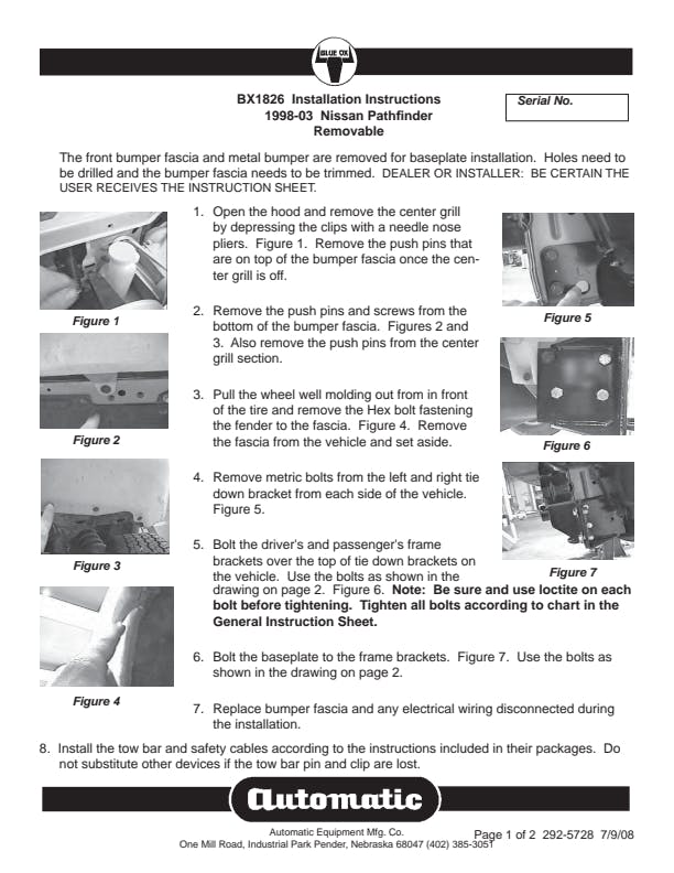 Please read BOTH these Installation Instructions and the General Information sheet prior to installing or operating this equipment. Blue Ox® towing products and accessories are intended to be installed by Blue Ox® Dealers who are familiar with our products and have the equipment and knowledge necessary to do “fit work”. Many Blue Ox® baseplates are designed to use existing holes and hardware to mount the baseplate to the towed vehicle. Even though bolts are there, do not assume they are adequate for baseplate mounting. Always use the hardware supplied in the hardware kit and existing hardware as specified in the installation instructions.