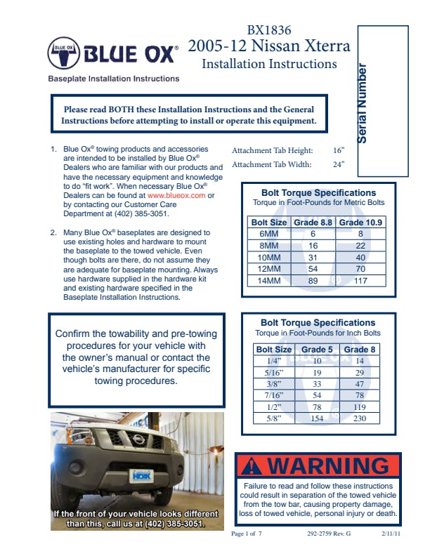 Please read BOTH these Installation Instructions and the General Information sheet prior to installing or operating this equipment. Blue Ox® towing products and accessories are intended to be installed by Blue Ox® Dealers who are familiar with our products and have the equipment and knowledge necessary to do “fit work”. Many Blue Ox® baseplates are designed to use existing holes and hardware to mount the baseplate to the towed vehicle. Even though bolts are there, do not assume they are adequate for baseplate mounting. Always use the hardware supplied in the hardware kit and existing hardware as specified in the installation instructions.