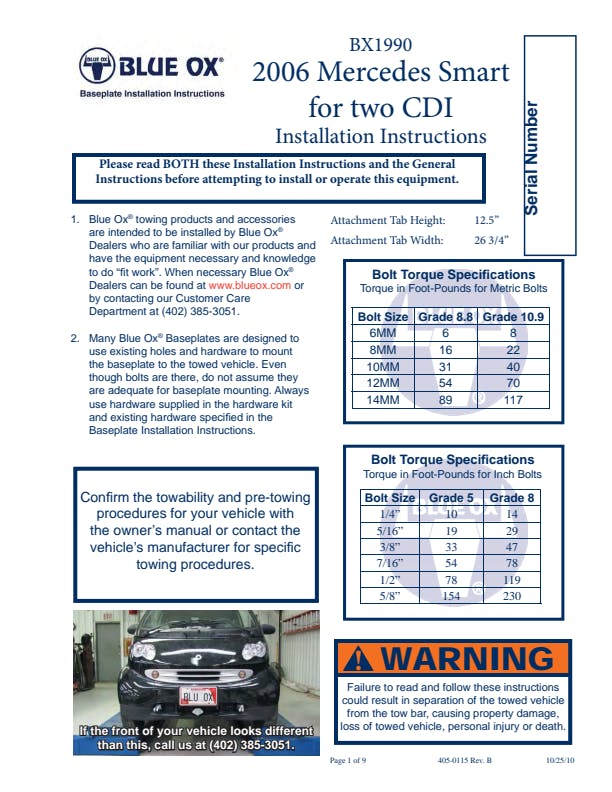 Please read BOTH these Installation Instructions and the General Information sheet prior to installing or operating this equipment. Blue Ox® towing products and accessories are intended to be installed by Blue Ox® Dealers who are familiar with our products and have the equipment and knowledge necessary to do “fit work”. Many Blue Ox® baseplates are designed to use existing holes and hardware to mount the baseplate to the towed vehicle. Even though bolts are there, do not assume they are adequate for baseplate mounting. Always use the hardware supplied in the hardware kit and existing hardware as specified in the installation instructions.