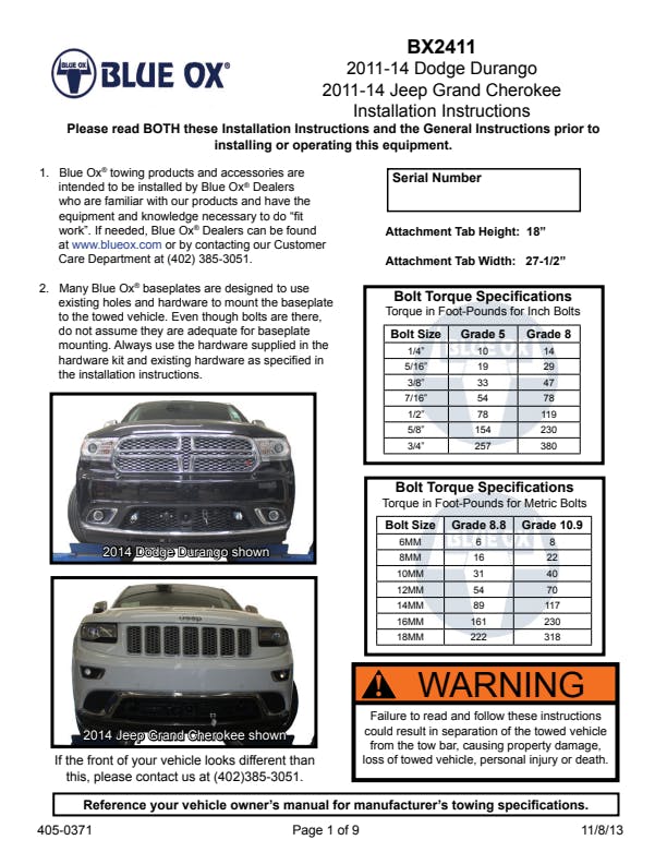 Please read BOTH these Installation Instructions and the General Information sheet prior to installing or operating this equipment. Blue Ox® towing products and accessories are intended to be installed by Blue Ox® Dealers who are familiar with our products and have the equipment and knowledge necessary to do “fit work”. Many Blue Ox® baseplates are designed to use existing holes and hardware to mount the baseplate to the towed vehicle. Even though bolts are there, do not assume they are adequate for baseplate mounting. Always use the hardware supplied in the hardware kit and existing hardware as specified in the installation instructions.