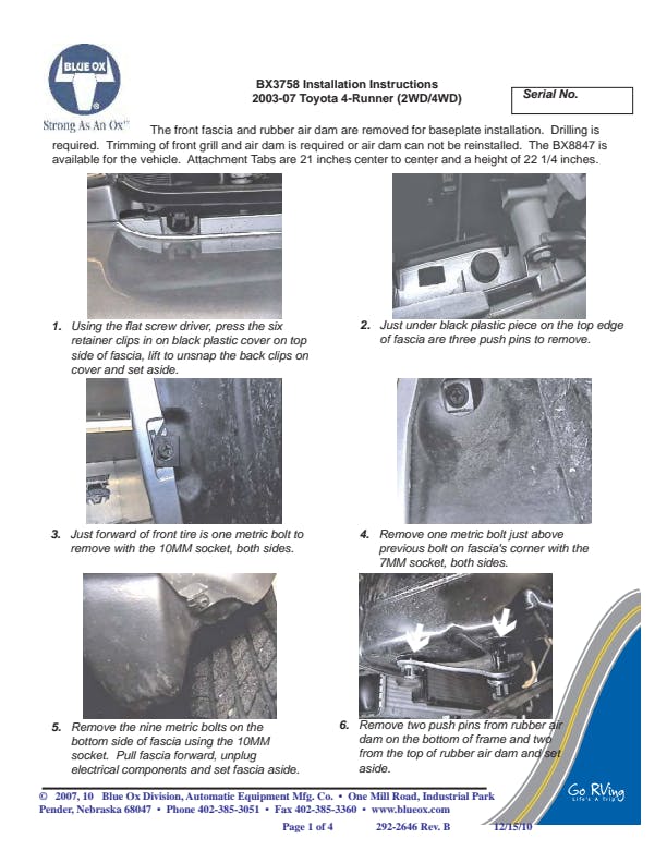 Please read BOTH these Installation Instructions and the General Information sheet prior to installing or operating this equipment. Blue Ox® towing products and accessories are intended to be installed by Blue Ox® Dealers who are familiar with our products and have the equipment and knowledge necessary to do “fit work”. Many Blue Ox® baseplates are designed to use existing holes and hardware to mount the baseplate to the towed vehicle. Even though bolts are there, do not assume they are adequate for baseplate mounting. Always use the hardware supplied in the hardware kit and existing hardware as specified in the installation instructions.