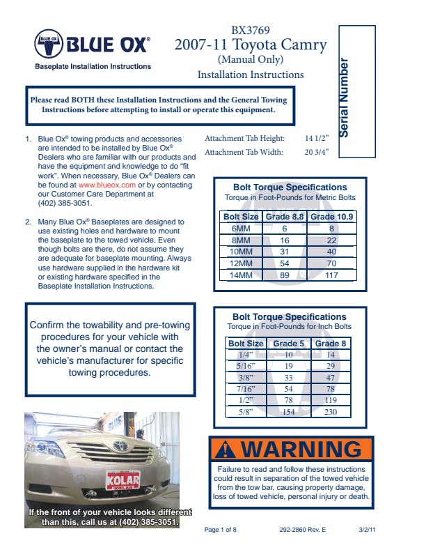 Please read BOTH these Installation Instructions and the General Information sheet prior to installing or operating this equipment. Blue Ox® towing products and accessories are intended to be installed by Blue Ox® Dealers who are familiar with our products and have the equipment and knowledge necessary to do “fit work”. Many Blue Ox® baseplates are designed to use existing holes and hardware to mount the baseplate to the towed vehicle. Even though bolts are there, do not assume they are adequate for baseplate mounting. Always use the hardware supplied in the hardware kit and existing hardware as specified in the installation instructions.