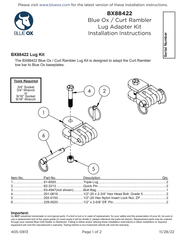 - Triple Lug Kit adapts Curt Rambler tow bar to Blue Ox baseplates.