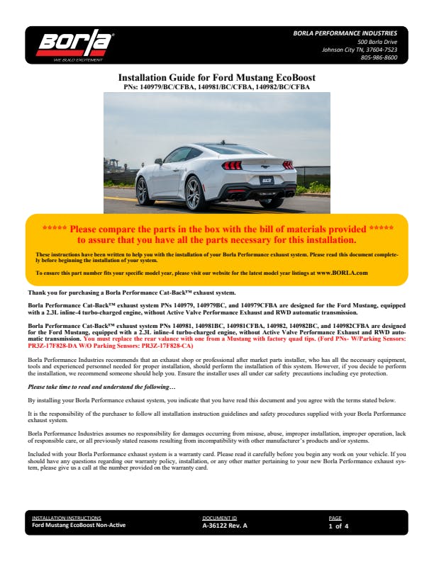 This 2.5" diameter BORLA® Cat-Back™ system is designed for use on EcoBoost cars WITHOUT the Active Exhaust feature. It features Borla's aggressive ATAK sound with no drone inside the vehicle, and dual 4" round black chrome on T-304 stainless steel tips. Using BORLA® Stainless Steel Polish p# 21499 is NOT recommended with these black chrome tips. We suggest cleaning the tips with hot water and a microfiber cloth. Systems with bright chrome on T-304 stainless steel tips, and carbon fiber tips are also available. If your car has 1 tip on each muffler and you want to upgrade it to 2 tips on each muffler (also known as quad tips), this is the system for you. It is designed to work with the quad tip (2 tips per muffler) Original Equipment (O.E.) Ford Valance ONLY. To install this system on a vehicle that came with one tip per muffler you will NEED TO BUY and install a different valance. Ford quad tip valance part numbers: With Parking Sensors = PR3Z-17F828-DA, Without Parking Sensors = PR3Z-17F828-CA. BORLA® Cat-Back™ and Axle-Back exhaust systems feature patented straight-through and multi-core technology designed to unleash hidden horsepower. Increased exhaust velocity adds power, driving excitement, fuel economy, and the distinctive BORLA® Sound of Power respected by motoring enthusiasts everywhere. Each system is built from premium T-304 stainless steel, superior to T-400 series knockoffs (such as 409), to give you the absolute best in performance and durability. Ultra-smooth mandrel bends ensure maximum flow & power, and precision computer numerical control (CNC) manufacturing ensures an accurate fit. Best of all, BORLA® stands behind every system with a Million-Mile Warranty. Just what you'd expect from the world's most experienced (and most winning) exhaust brand.