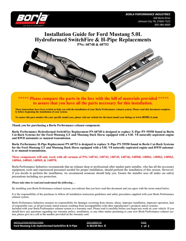 Designed to work with BORLA® 3" Cat-Back™ Systems ONLY. This Hydroformed BORLA® SwitchFire® X-Pipe is designed to replace the Merge X-Pipe in BORLA® Cat-Back™ Systems for '18-'25 Mustang GT/ '24-'25 Mustang Dark Horse. By using Hydroforming in the manufacturing process we are able to have a lower profile on this part than a conventional SwitchFire® X-Pipe. This SwitchFire® X-Pipe is 21.1" Long x 7.8" Wide x 5" High, with 2.75" O.D. Inlet and 3" I.D. Outlet. Completely eliminating the turbulent center intersection of a standard X-Pipe, BORLA®'S patented SwitchFire® design truly blends the combustion pulses from both sides of the engine for improved performance. The result is an aggressive custom sound and improved power. Each SwitchFire® X-Pipe is built from premium, high-quality T-304 austenitic stainless steel, superior to T-400 series knockoffs (such as 409), to give you the absolute best in performance and durability. Ultra-smooth mandrel bends ensure maximum flow & power, and precision computer numerical control (CNC) manufacturing ensures an accurate fit. Best of all, BORLA® stands behind every SwitchFire® X-Pipe with a Million-Mile Warranty. Just what you'd expect from the world's most experienced (and most winning) exhaust brand.