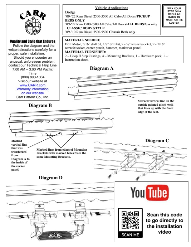 HOOP II Black features a uniquely designed diamond tread pattern provides a safe, non-slip surface on the flat step area. Our exclusive multi-mount system is designed for a precision fit and easier installation. The Hoop II step is constructed from extremely strong die-cast aluminum alloy for maximum quality and durability and is available in black, sIlver or safety yellow powder coated finishes or a high luster polished finish. Applications for Chevrolet, Ford, RAM, Toyota, Nissan and most popular trucks and vans. CARR steps are backed by a limited lifetime warranty.