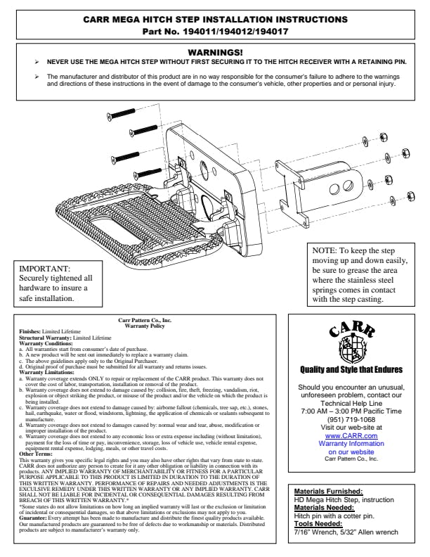 All CARR accessories are manufactured for a precise fit for today's vehicles. Our manufacturing processes allows us to design products that give your vehicle unique personal style and appeal. Our cast aluminum construction is time-proven for durability and strength. All CARR products carry a limited lifetime warranty.