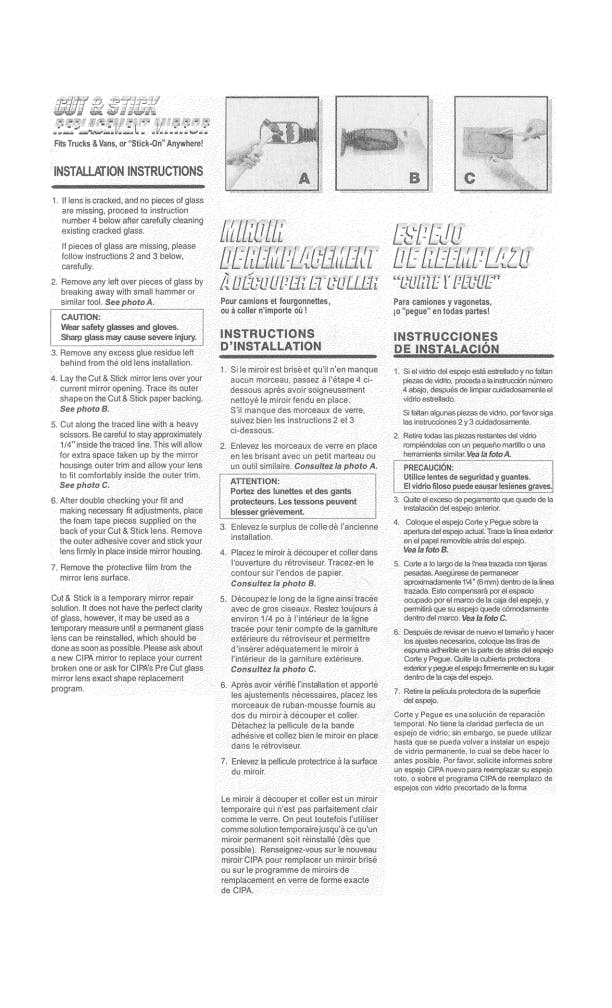 Temporarily replace broken glass with our Trim to Fit mirror kit. Acrylic lens cuts easily with scissors. Fits cars, motorcycles, and many other uses. Peel and stick mounting.