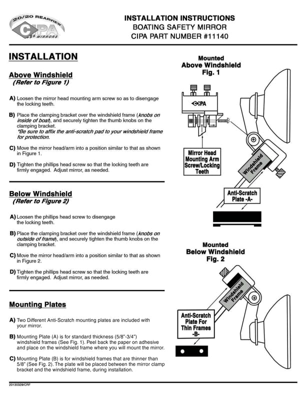 CIPAs Boating Safety Mirror is for water skiing and general boating safety. It features a fully adjustable anti-scratch, quick mount plastic bracket that fits square windshields up to 3/4 of an in. thick. The Boating Safety Mirror is designed to universally mount above or below the windshield frame, offering maximum rear view with a few simple adjustments. The ability to mount in the down position makes this mirror perfect for boats with walk-thru windshields. The mirror head on the Boating Safety Mirror measures 4.25 x 8 inches and features a convex acrylic safety lens for wide angle viewing and added safety. Each package includes two different anti-scratch mounting plates. One for standard thickness windshield frames (5/8- in. to 3/4- in.), and the other for frames thinner than 5/8- inches. Mirrors are made with non-corrosive materials and are salt spray tested.