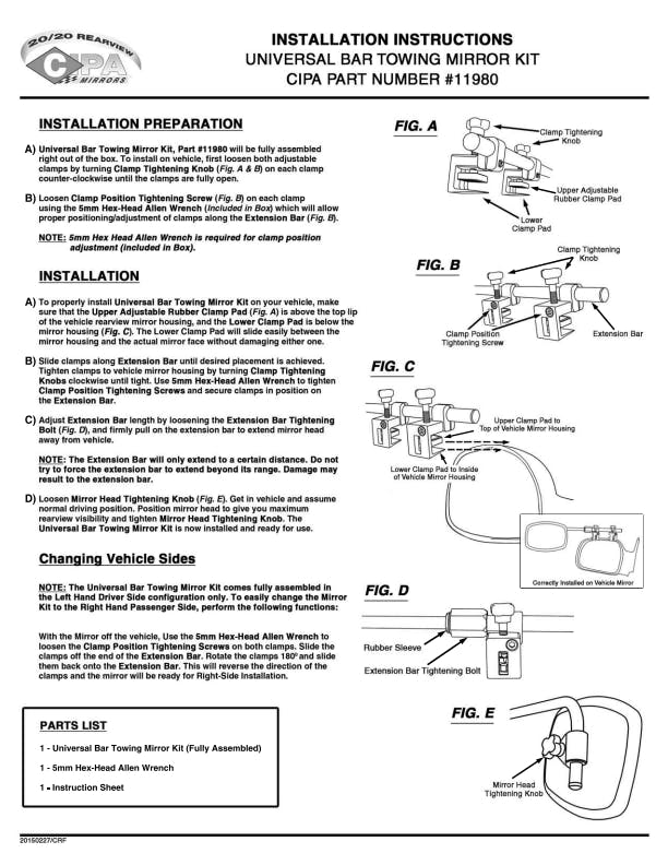 CIPA Universal steel bar towing Mirror Kit. This adjustable extendable mirror provides superior vision around blind spots. Fits most mirror housings. Adjustable dual clamp bar mounts directly to your existing mirror with 2 mounting adjustment screws and clamps provided in package. Features a large adjustable convex glass mirror measuring 7.50 X 4.75. Mirror sold as singl