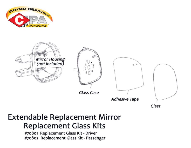 CIPA's Magna Extendable Replacement Mirror Driver Side Glass Kit is for replacement of cracked or broken glass on the classic style Magna Extendable Replacement Driver Side Mirror. This part replaces the mounting plate and glass for part numbers 70011, 70121, 70211, 70511, 70611, 70711, 72011, 72111, 72511, 73011, 73121, 73211, 73511, 73611, 80011, 80111, 82011, 82111, 83011, and 83111 - or - the driver side mirror (only) for part numbers 70000, 70100, 70200, 70500, 70600, 70700, 72000, 72100, 72500, 73000, 73100, 73200, 73500, 73600, 80000, 80100, 82000, 82100, 83000, and 83100 - or - the driver side mirror (only) on the following trucks equipped with Magna Extendable Replacement Mirrors: 1988-2000 Chevrolet CK Pickup, 1999-2006 Chevrolet Silverado, 1992-2006 Chevrolet Suburban, 1995-2006 Chevrolet Tahoe, 2000 Chevrolet Tahoe Limited, 1994-1997 Dodge Ram, 1998-2008 Dodge Ram 1500, 1998-2008 Dodge Ram 2500, 1998-2008 Dodge Ram 3500, 1997-2002 Ford F-150, 1998-2006 Ford F-250, 1998-2006 Ford F-250, 1998-2006 Ford F-350, 1998-2006 Ford F-450, 1998-2006 Ford F-550, 1988-2006 GMC Sierra, 1992-2006 GMC Yukon, 1988-2000 GMC Yukon Denali, and 2000-2006 GMC Yukon XL. The Magna Extendable Replacement Mirror Driver Side Glass Kit includes the driver side glass, glass removal tool, and instructions. Mirror assembly not included.