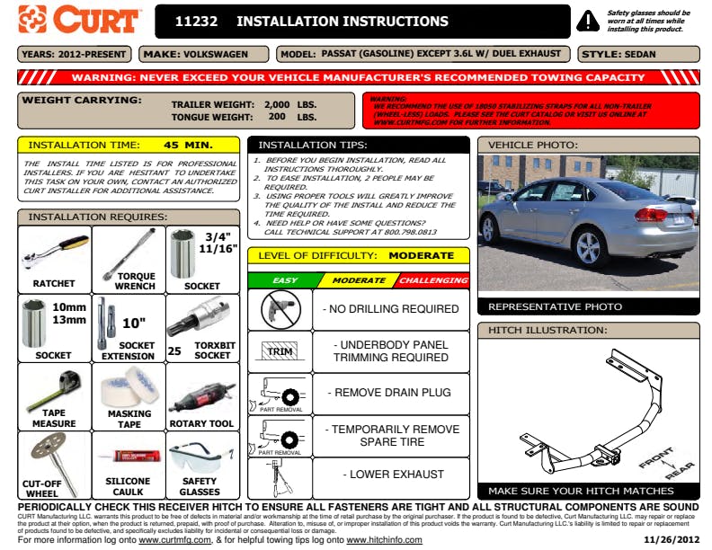 However you define adventure -- whether it's climbing onto the back of a mountain bike, hunting from the top of a tree stand or camping with the family a long way from nowhere -- CURT class 1 hitches provide a light-duty towing receiver to help you Bring It. Each is made to fit a specific vehicle, providing easier installation, a better fit and optimal towing capacity. Custom class 1 trailer hitches are available for a variety of smaller vehicle types, including the compact car, crossover, minivan and small SUV. This particular class 1 hitch is designed to be a custom hitch for certain years of the Volkswagen Passat (to verify vehicle compatibility, see the CURT application guide at curtmfg.com). Tested in accordance with SAE J684, it offers a weight carrying capacity of 2,000 lbs. GTW and 200 lbs. TW. It is equipped with 1-1/4 receiver tube opening to accept a ball mount shank or other hitch mount. This class 1 hitch also comes with all necessary mounting hardware. With its lightweight design and smaller receiver tube size, a class 1 hitch is especially useful for adding cargo space with a hitch-mounted bike rack or cargo carrier. They can also typically be used to tow small trailers such as a utility trailer, kayak trailer or teardrop camper (never exceed the lowest weight capacity of any towing component; i.e. the vehicle, hitch, trailer, etc). Though CURT class 1 trailer hitches are only intended for light-duty towing, we apply the same principles of quality as we do to the rest of our rear mount hitches. Each class 1 hitch is made with hands-on engineering, high-strength steel and precise welding. We use a co-cured finish of liquid A-coat, inside and out, and durable black powder coat to provide a lasting defense against rust, chips and UV rays.