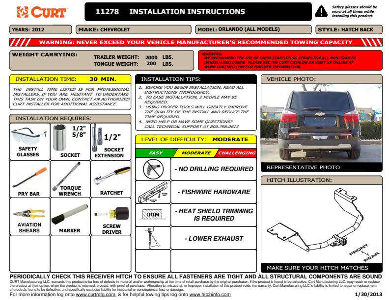 However you define adventure -- whether it's climbing onto the back of a mountain bike, hunting from the top of a tree stand or camping with the family a long way from nowhere -- CURT class 1 hitches provide a light-duty towing receiver to help you Bring It. Each is made to fit a specific vehicle, providing easier installation, a better fit and optimal towing capacity. Custom class 1 trailer hitches are available for a variety of smaller vehicle types, including the compact car, crossover, minivan and small SUV. This particular class 1 hitch is designed to be a custom hitch for certain years of the Chevy Orlando (to verify vehicle compatibility, see the CURT application guide at curtmfg.com). Tested in accordance with SAE J684, it offers a weight carrying capacity of 2,000 lbs. GTW and 200 lbs. TW. It is equipped with 1-1/4 receiver tube opening to accept a ball mount shank or other hitch mount. This class 1 hitch also comes with all necessary mounting hardware. With its lightweight design and smaller receiver tube size, a class 1 hitch is especially useful for adding cargo space with a hitch-mounted bike rack or cargo carrier. They can also typically be used to tow small trailers such as a utility trailer, kayak trailer or teardrop camper (never exceed the lowest weight capacity of any towing component; i.e. the vehicle, hitch, trailer, etc). Though CURT class 1 trailer hitches are only intended for light-duty towing, we apply the same principles of quality as we do to the rest of our rear mount hitches. Each class 1 hitch is made with hands-on engineering, high-strength steel and precise welding. We use a co-cured finish of liquid A-coat, inside and out, and durable black powder coat to provide a lasting defense against rust, chips and UV rays.