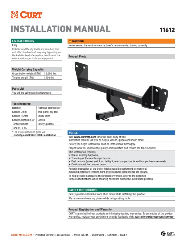 However you define adventure -- whether it's climbing onto the back of a mountain bike, hunting from the top of a tree stand or camping with the family a long way from nowhere -- CURT class 1 hitches provide a light-duty towing receiver to help you Bring It. Each is made to fit a specific vehicle, providing easier installation, a better fit and optimal towing capacity. Custom class 1 trailer hitches are available for a variety of smaller vehicle types, including the compact car, crossover, minivan and small SUV. This particular class 1 hitch is designed to be a custom hitch for certain years of the Buick Encore GX and Chevrolet Trailblazer (to verify vehicle compatibility, see the CURT application guide at curtmfg.com). Tested in accordance with SAE J684, it offers a weight carrying capacity of 2,000 lbs. GTW and 200 lbs. TW. It is equipped with 1-1/4" receiver tube opening to accept a ball mount shank or other hitch mount. This class 1 hitch also comes with all necessary mounting hardware. With its lightweight design and smaller receiver tube size, a class 1 hitch is especially useful for adding cargo space with a hitch-mounted bike rack or cargo carrier. They can also typically be used to tow small trailers such as a utility trailer, kayak trailer or teardrop camper (never exceed the lowest weight capacity of any towing component; i.e. the vehicle, hitch, trailer, etc). Though CURT class 1 trailer hitches are only intended for light-duty towing, we apply the same principles of quality as we do to the rest of our rear mount hitches. Each class 1 hitch is made with hands-on engineering, high-strength steel and precise welding. We use a co-cured finish of liquid A-coat, inside and out, and durable black powder coat to provide a lasting defense against rust, chips and UV rays.