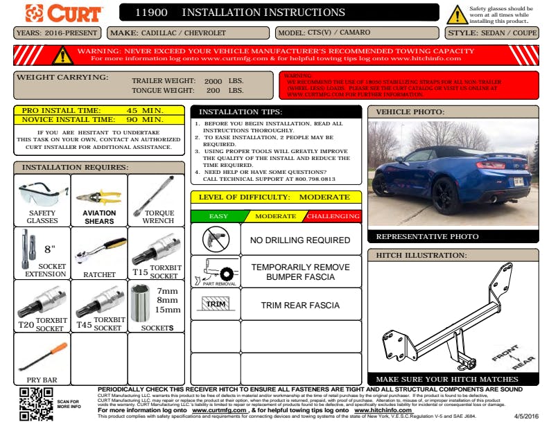 Connect to your lifestyle with a custom hitch receiver from CURT. All of our custom hitches are designed for a vehicle-specific fit, manufactured with pride, finished for industry-leading rust resistance and tested to rigorous SAE J684 standards for safety. This class 1 trailer hitch and ball mount combination is designed for a custom fit on select years of the Cadillac CTS and Chevrolet Camaro (see application info to verify fitment). The hitch integrates with the vehicle's frame and provides a useful and dependable 1-1/4" x 1-1/4" receiver. The receiver is perfect for attaching the included ball mount and towing a small trailer, or for adding cargo space with a hitch-mounted cargo carrier, bike rack or other accessory. This particular class 1 hitch is rated for 2,000 pounds gross trailer weight and 200 pounds tongue weight (never exceed the lowest-rated towing component). The ball mount included with this trailer hitch quickly and easily installs into the hitch receiver and has a 3/4" trailer ball hole (trailer ball not included). It can be mounted in the rise or drop position to promote level towing. Like all CURT custom hitches, this class 1 hitch is protected with our co-cured finishing process. It is descaled for a smooth surface, immersed in liquid A-coat for rust resistance inside and out, covered with a durable black powder coat and finally co-cured for an industry-leading rust, chip and UV-resistant shield. No matter where you're headed or which season of the year you’re towing in, this CURT hitch is equipped for long-lasting resilience to the elements. It features an open-back receiver for easy cleaning, and it comes with all the hardware necessary for the installation.